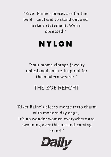 At River Raine, we’re obsessed with the bold, fearless energy of vintage jewelry from the ‘70s, ‘80s, and ‘90s—back when style had no rules and bigger was always better. We take those iconic vibes and mix them with a modern twist, creating pieces that feel both nostalgic and fresh. Every design is crafted with intention, made to stand out, and meant to be worn by those who aren’t afraid to make a statement.