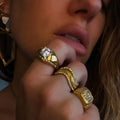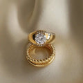 Stunning and bold gold dome ring with large round brilliant cut CZ. This is a beautiful ring that is meant to stand out. Pair it with your other chunky pieces to make a statement and to go for that vintage-vibe.