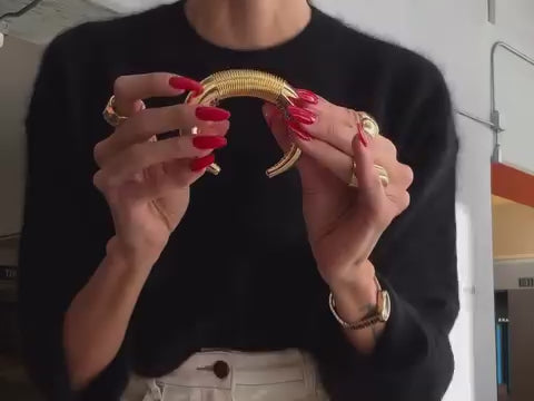 This heavyweight cuff is a statement-maker from every angle. Crafted with a sculptural hollow-core design and finished in radiant 18k gold electroplating, it delivers that high-shine, high-impact look without the weight.