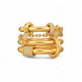 Add edge to your ring game with this bold, triple band chain ring. Designed with three sleek 18k gold-plated bands connected by a delicate gold chain, this piece fuses elegance with attitude.