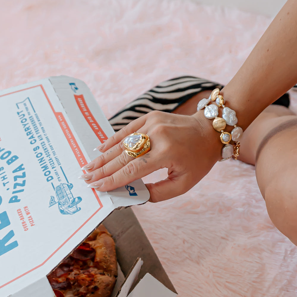 This Freshwater Pearl & Gold Statement Bracelet features organic, oversized baroque pearls paired with textured 18k electroplated gold beads and accents.