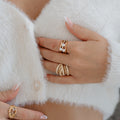 This standout ring features three glossy pearls set atop chunky, wavy gold bands, bringing a modern, organic feel to any outfit. The sculptural texture catches the light beautifully, giving it that “I just threw this on and look amazing” energy.